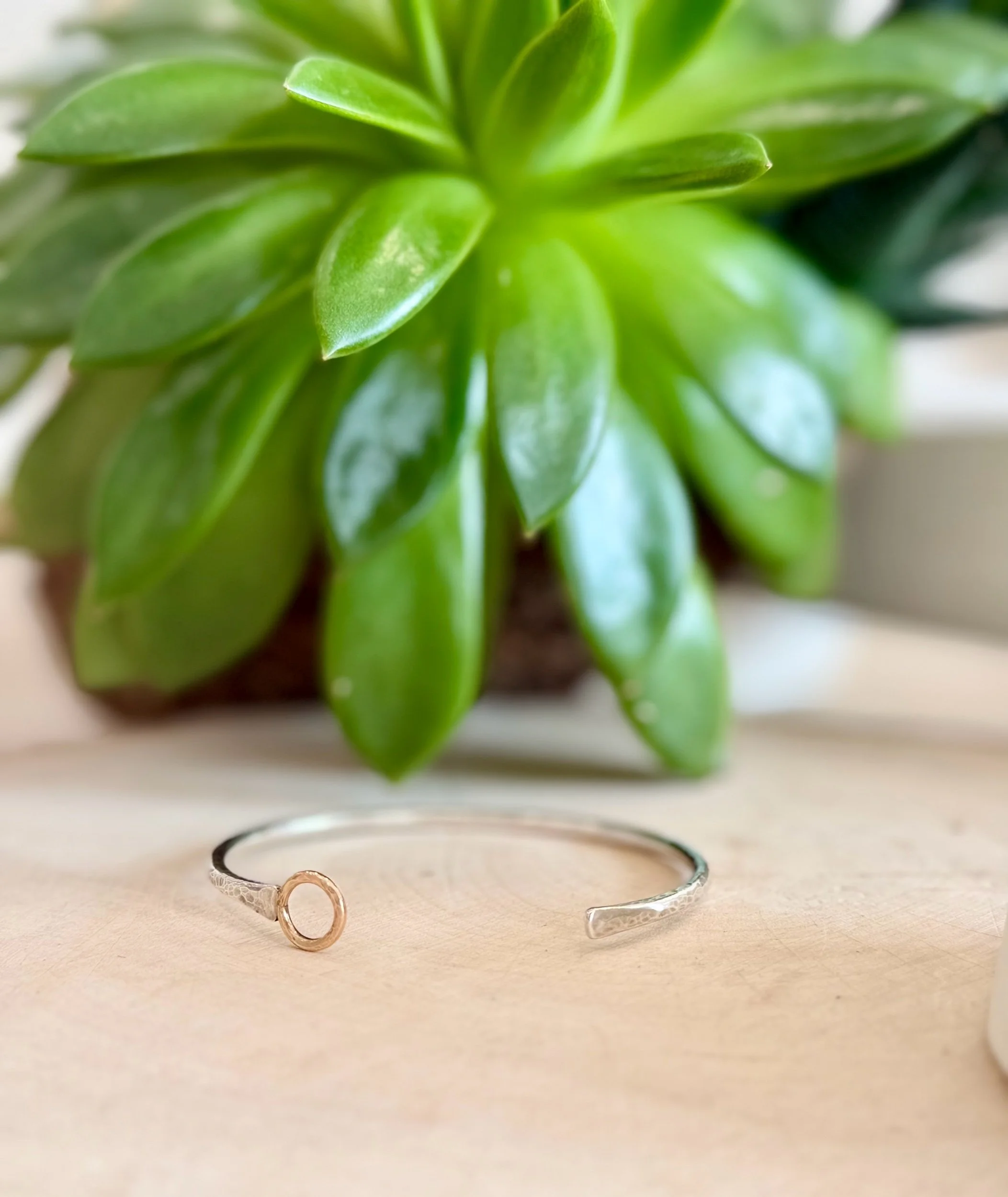 Sterling silver cuff with 14k gold fill circle detail at opening.