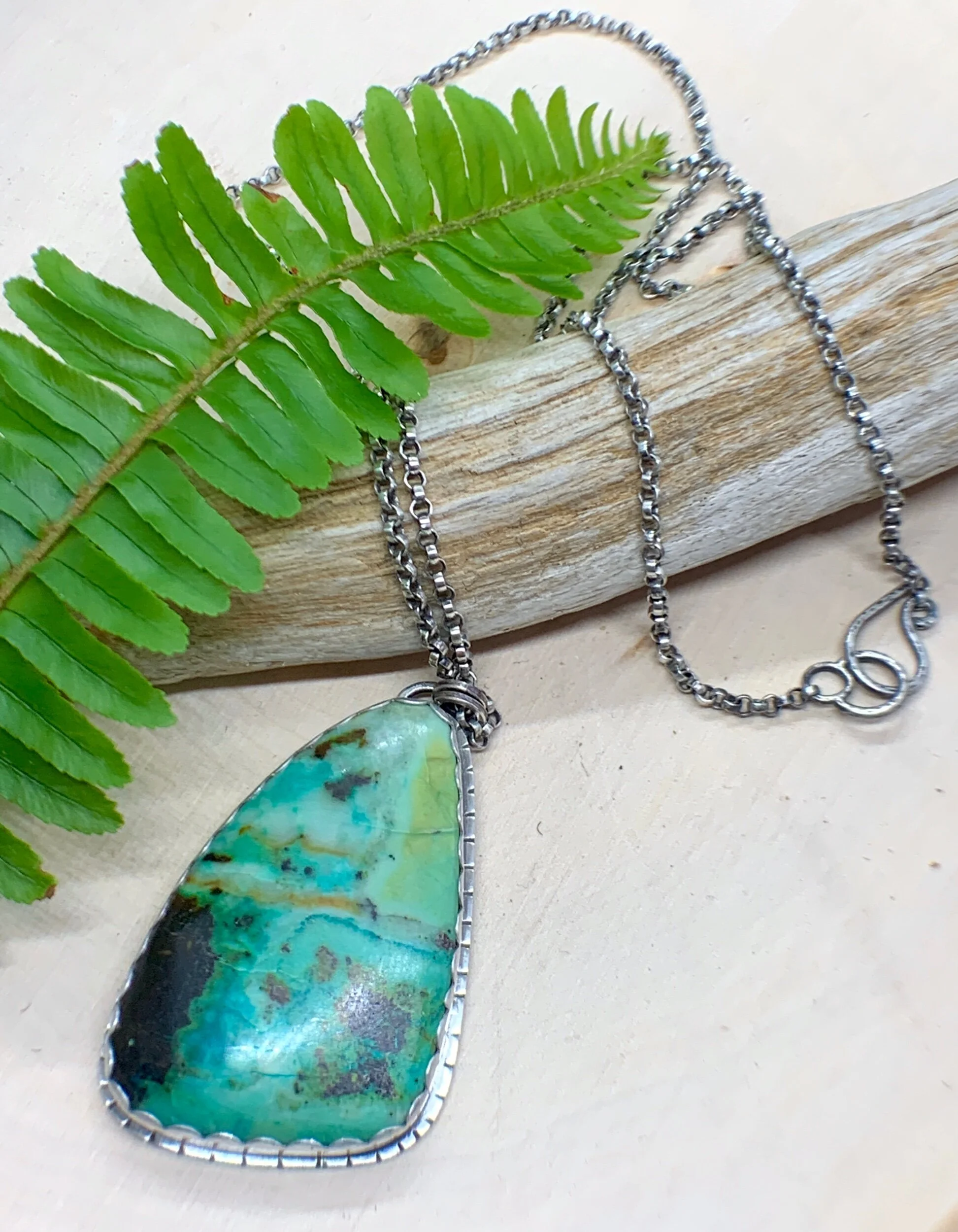 This pendant is fabricated from sterling silver and has a beautiful ocean blue teardrop shaped turquoise. It’s set in a scalloped bezel with a small silver beaded border at the bottom. It hangs from a 16” textured oxidized chain and finished with a handmade clasp.